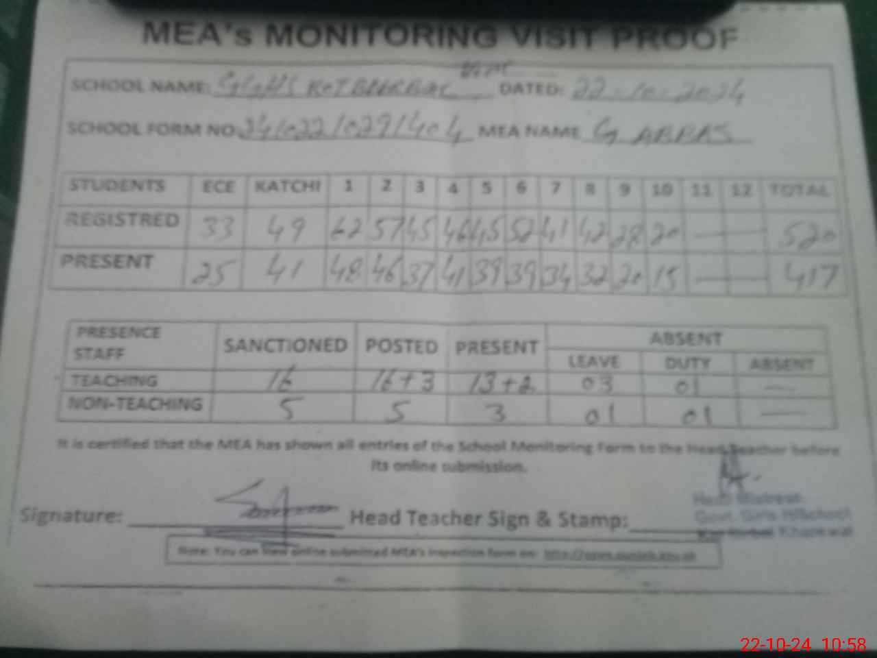 | Attendance Register | Head Teacher | MEA with School | Visit Proof |