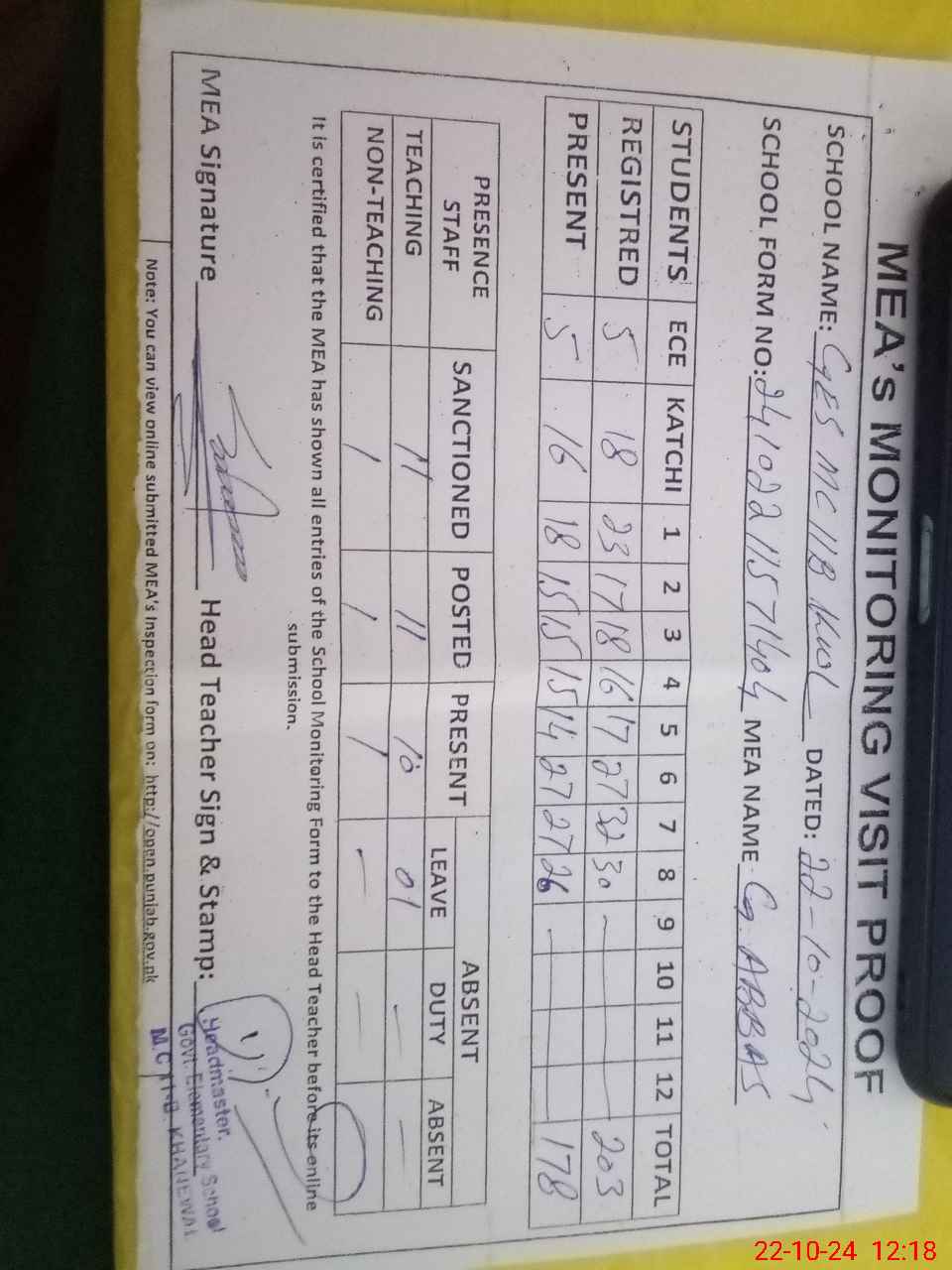 | EMIS Code: 36420637 | Name of School: GES MC 11-B KHANEWAL | |||