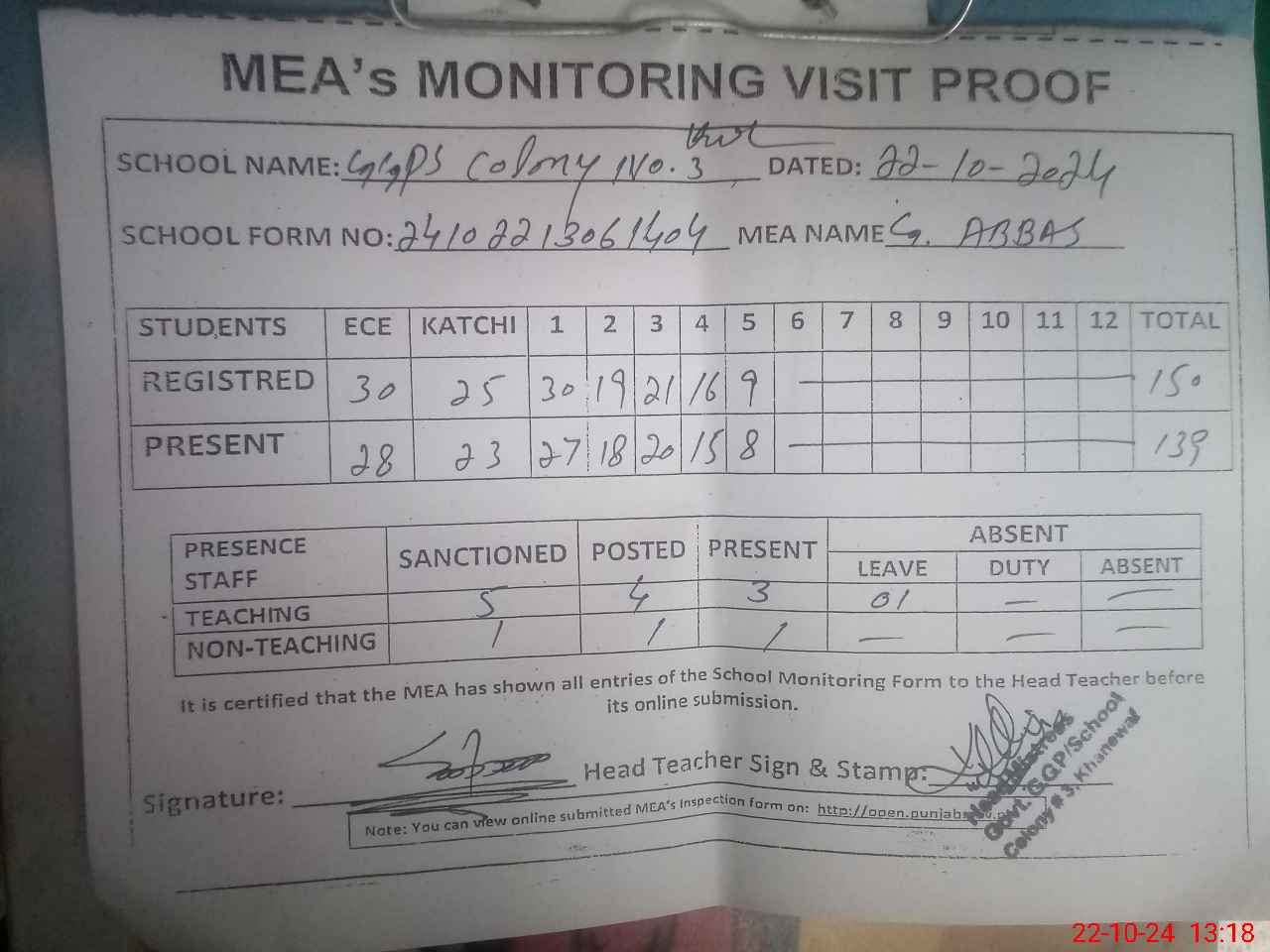 | Attendance Register | Head Teacher | MEA with School | Visit Proof |