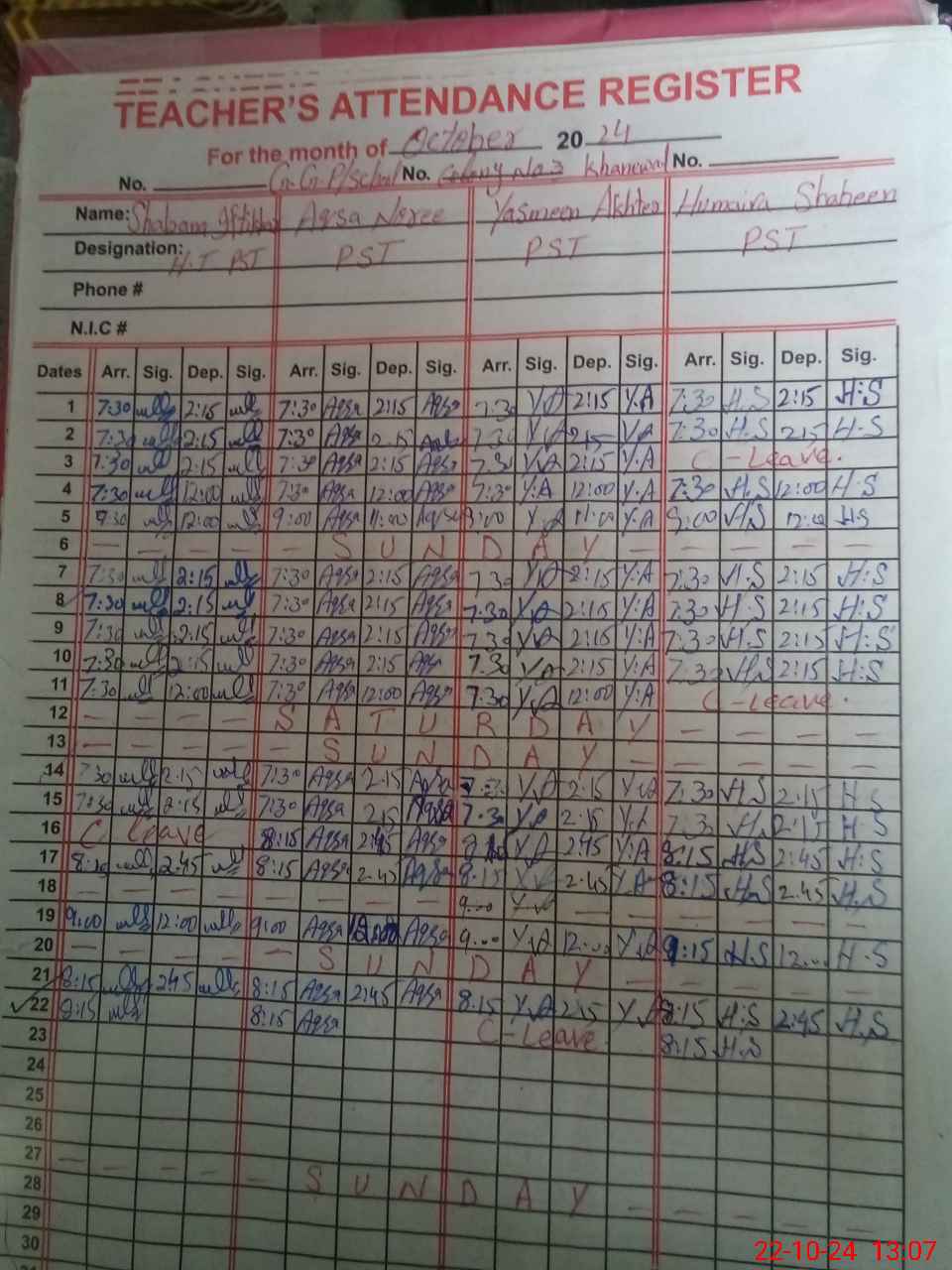 | CNIC | Full Name | Designation | R/C | Absence during last cal. month |
