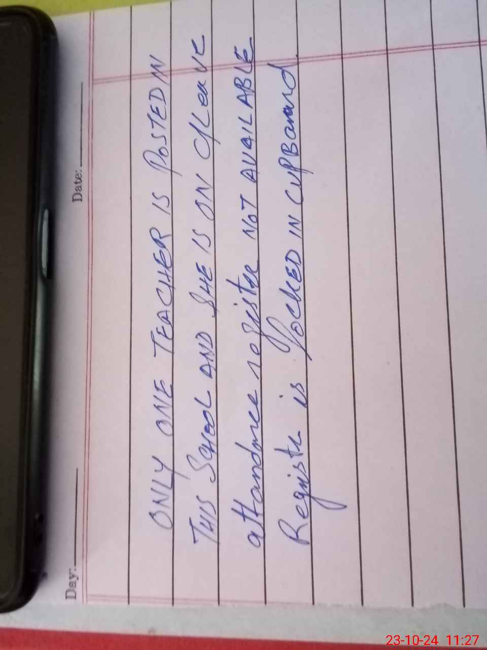 | Remarks (Use Separate Page if Required): Only one teacher is working in this school and she is on leave during visit all record including attendance register is locked and no key is available only roznamcha is available and 02 private teachers are handling the school | |||||