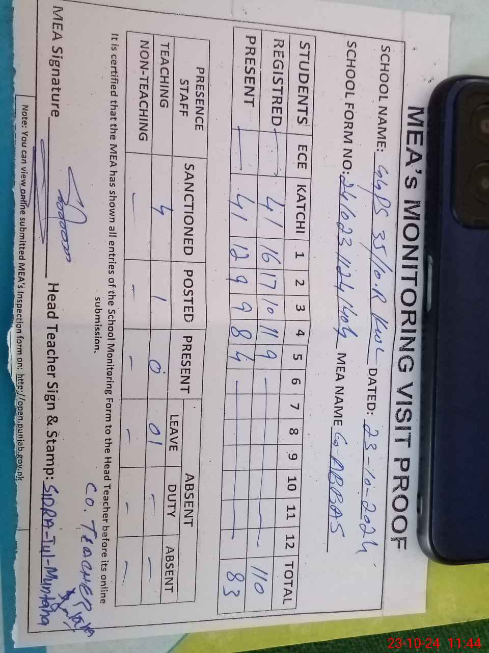 | Attendance Register | Head Teacher | MEA with School | Visit Proof |