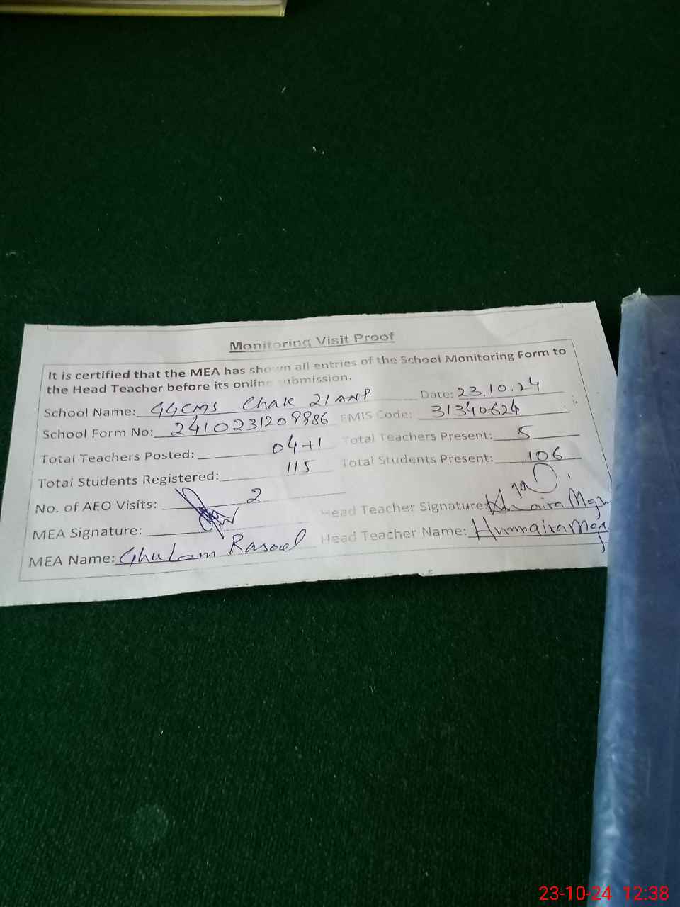 | Attendance Register | Head Teacher | MEA with School | Visit Proof |