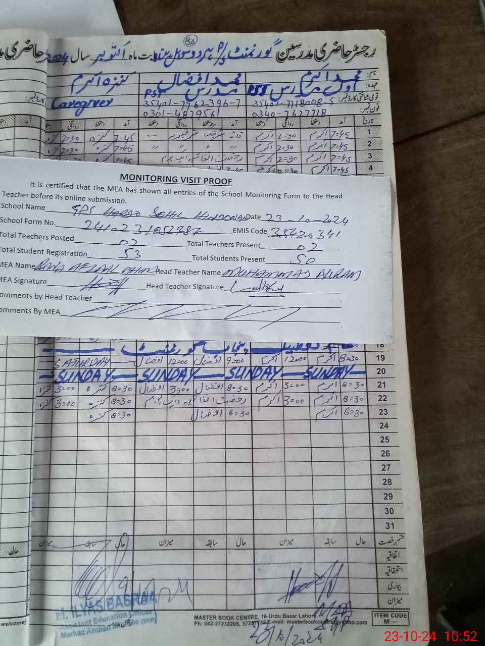 | Attendance Register | Head Teacher | MEA with School | Visit Proof |