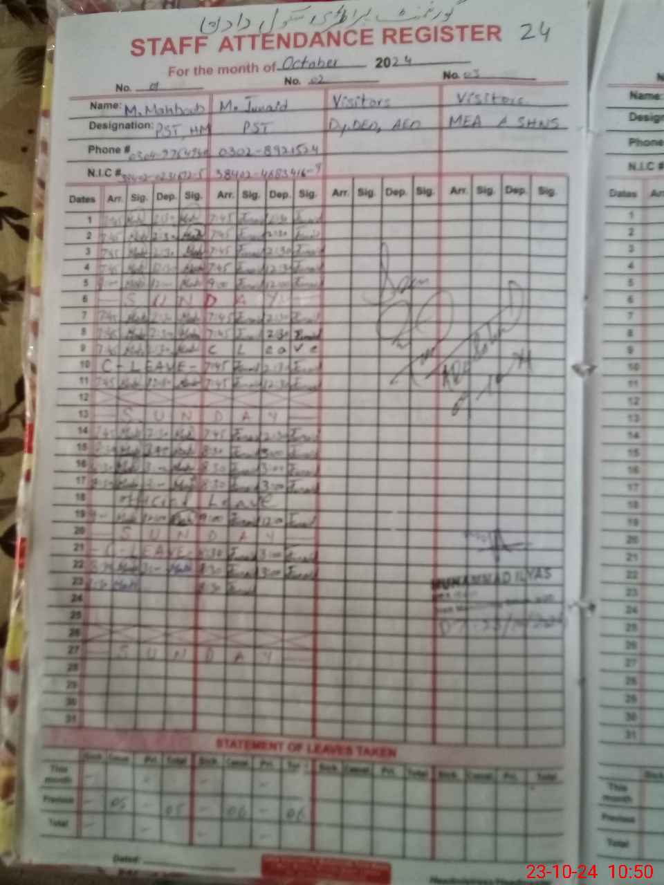 | Name: MU**** JU**** Designation: (School Headmaster's/Headmistress's) PST Phone/Cell Number: 03**** |