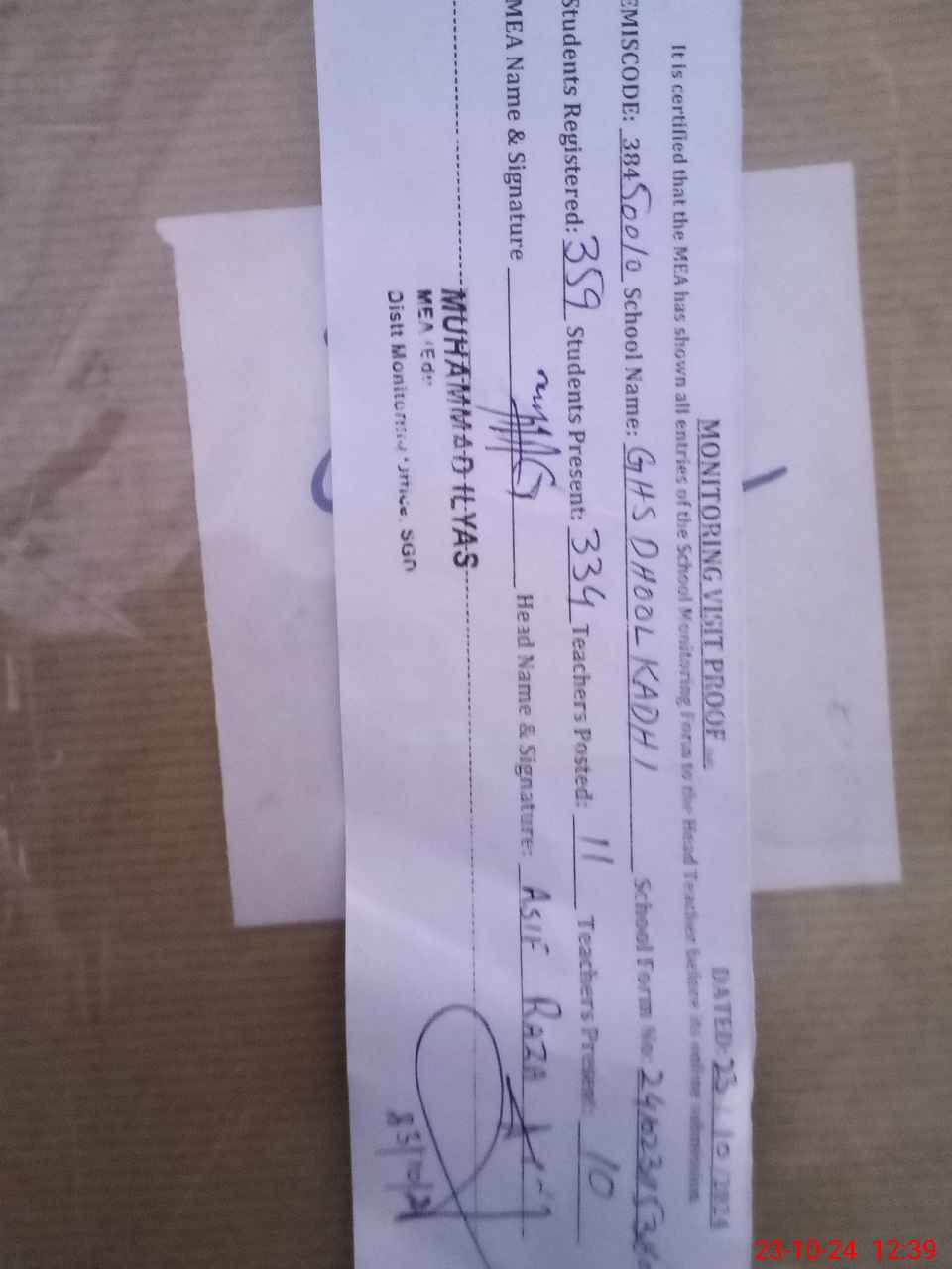 | Certified that this School was Inspected by the Undersigned MEA/DMO Today and the Information Stated Above is as Per Record. | |||||
