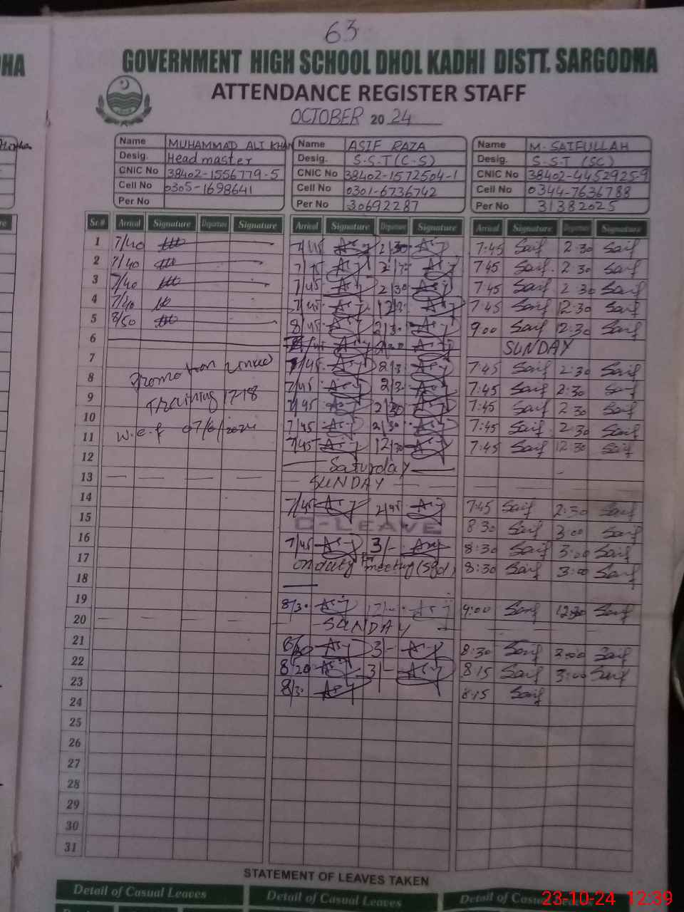 | CNIC | Full Name | Designation | R/C | Absence During Last Calender Month |