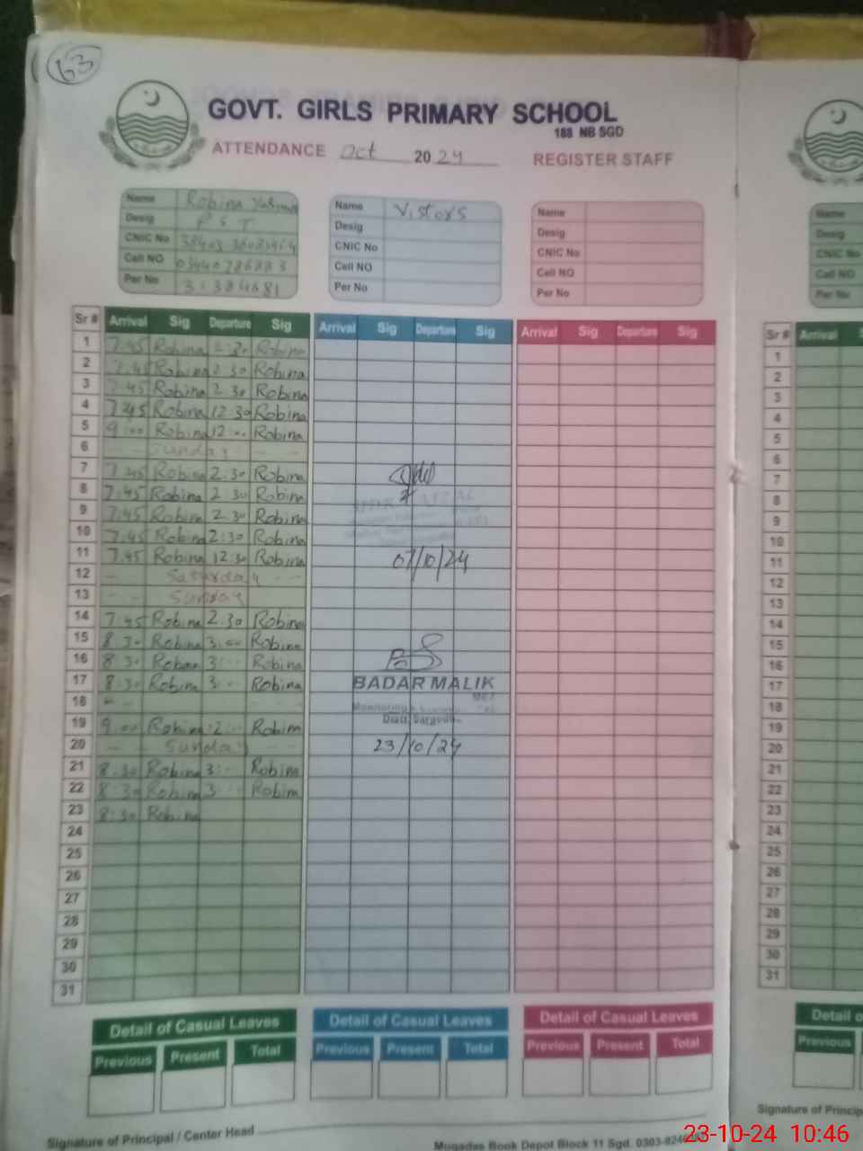 | Name: RO**** YA**** Designation: (School Headmaster's/Headmistress's) PST Phone/Cell Number: 03**** |