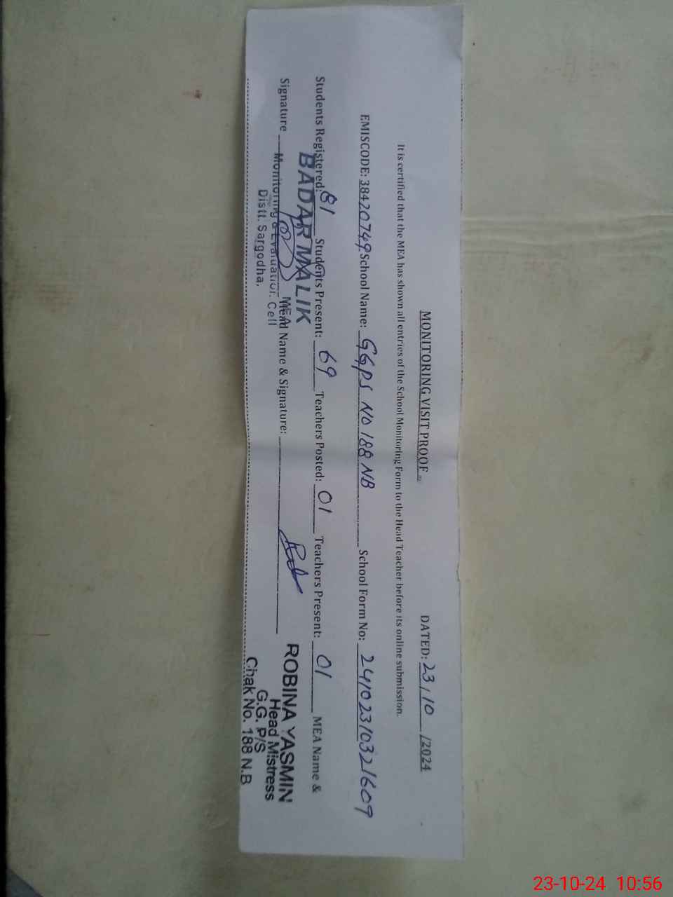 | Attendance Register | Head Teacher | MEA with School | Visit Proof |