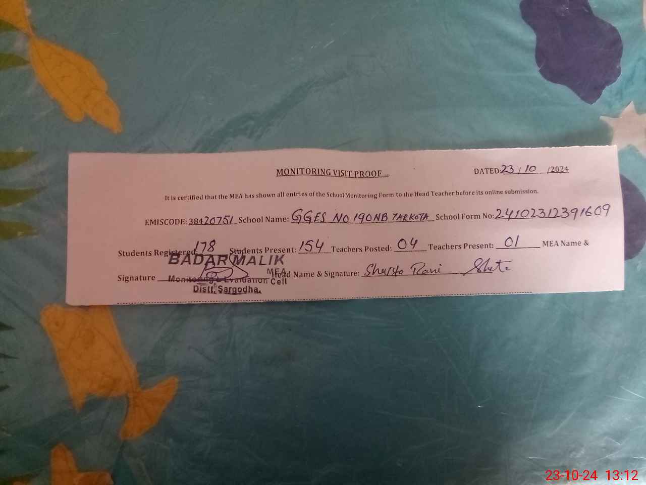 | Attendance Register | Head Teacher | MEA with School | Visit Proof |