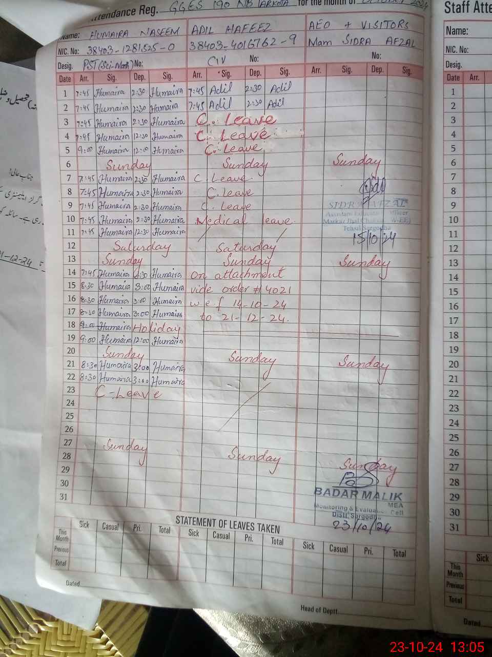 | CNIC | Full Name | Designation | R/C | Absence During Last Calender Month |