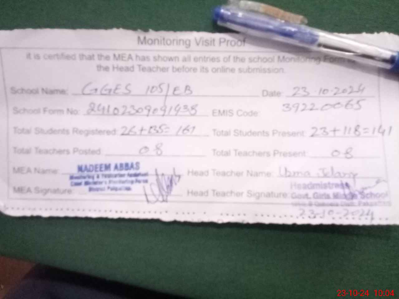 | Attendance Register | Head Teacher | MEA with School | Visit Proof |