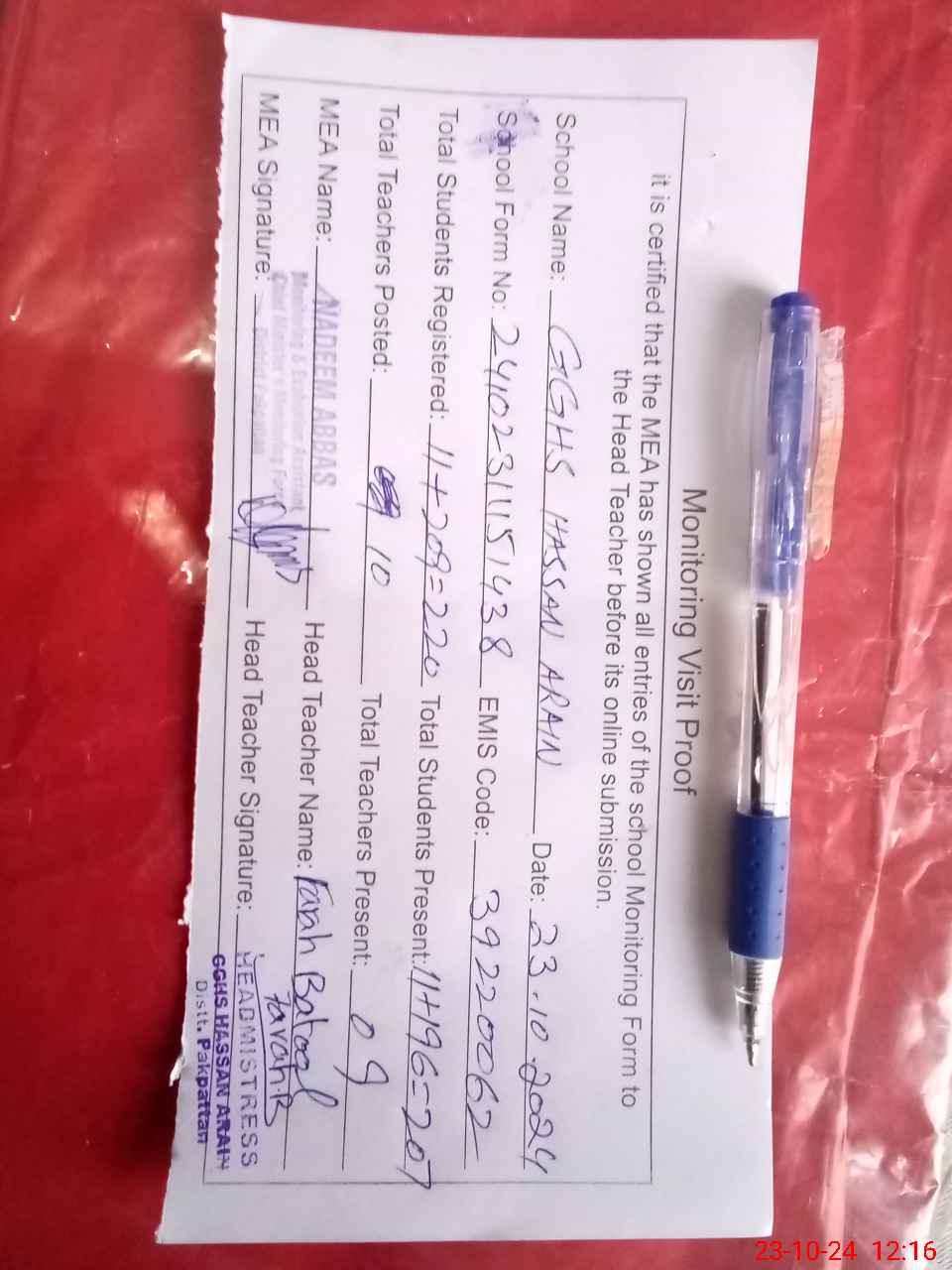 | EMIS Code: 39220062 | Name of School: GGHS HASSAN ARAIN | |||