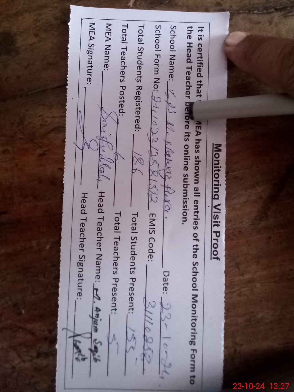 | Attendance Register | Head Teacher | MEA with School | Visit Proof |