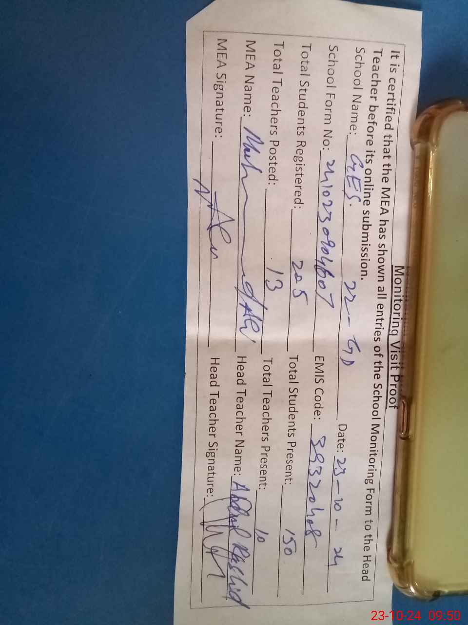 | Attendance Register | Head Teacher | MEA with School | Visit Proof |
