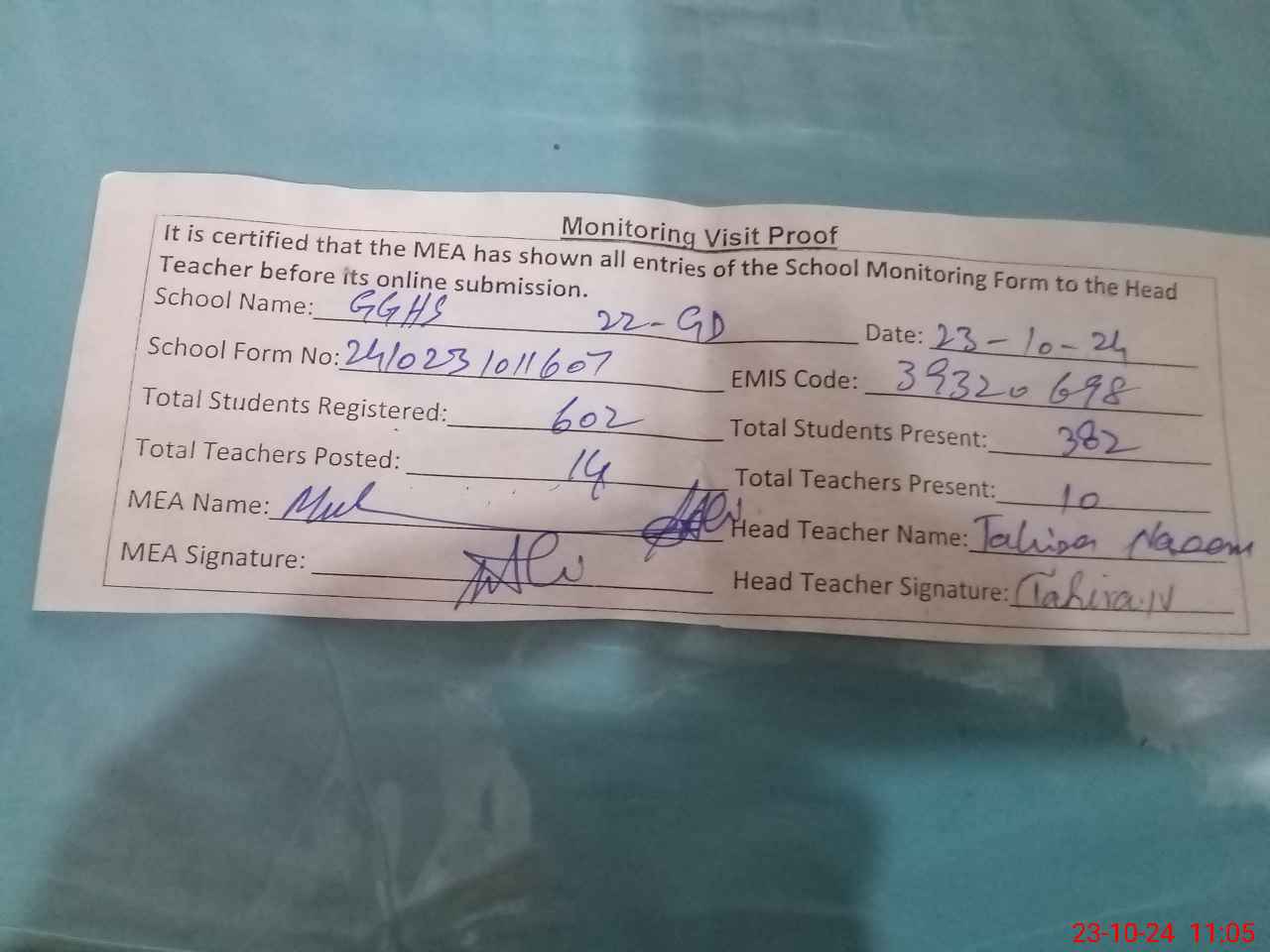 | EMIS Code: 39320698 | Name of School: GGHS 22/G.D | |||