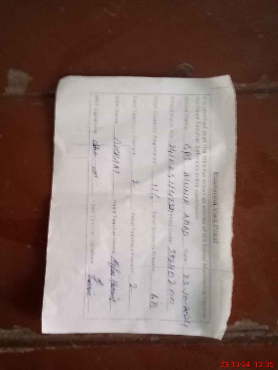| Certified that this School was Inspected by the Undersigned MEA/DMO Today and the Information Stated Above is as Per Record. | |||||