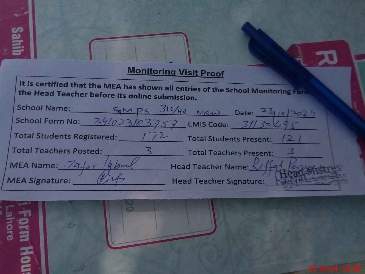 | EMIS Code: 31130495 | Name of School: GMPS CHAK NO. 310 HR (NEW) | |||