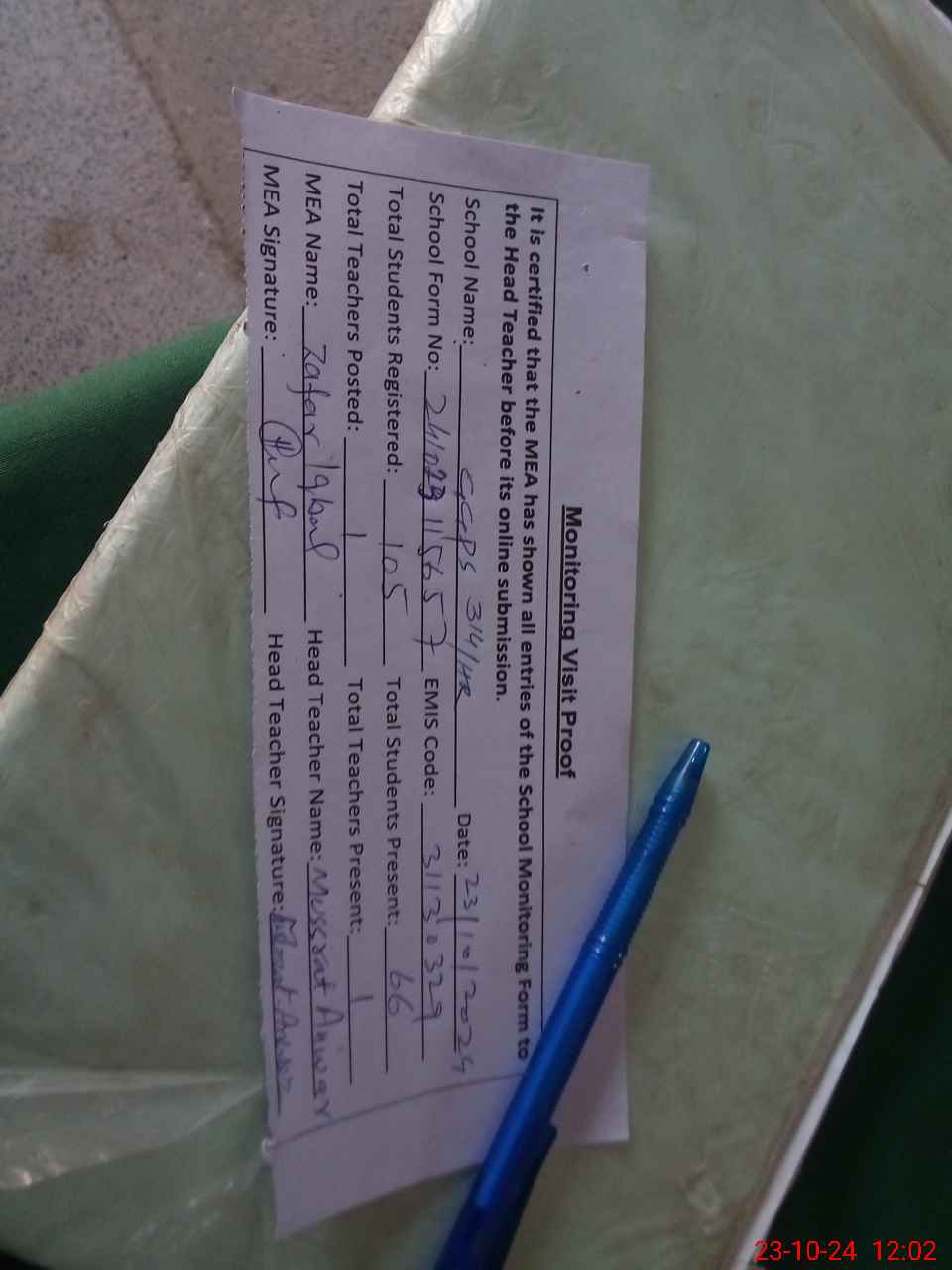 | Attendance Register | Head Teacher | MEA with School | Visit Proof |
