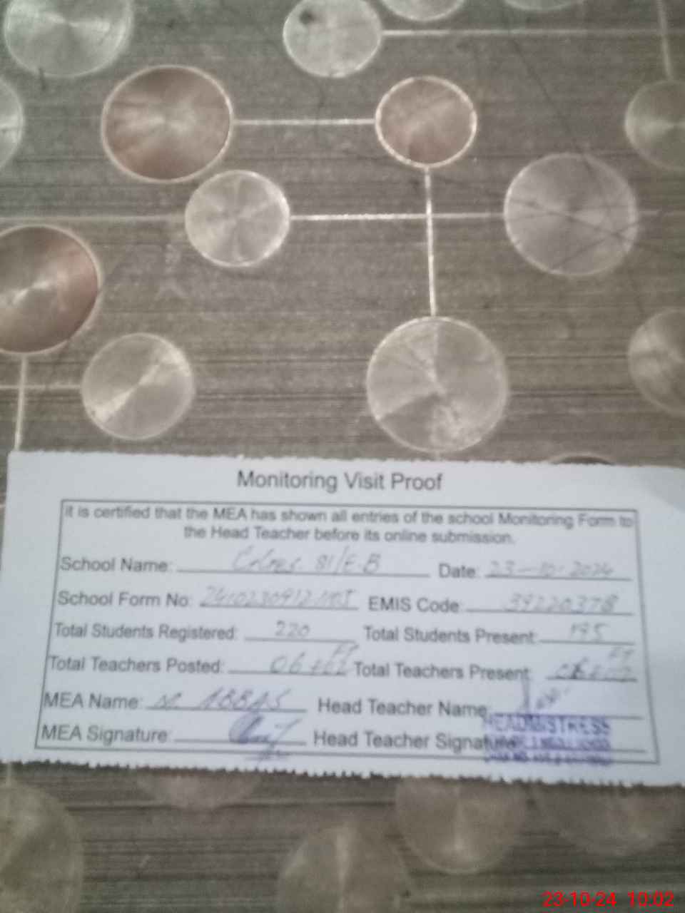 | Attendance Register | Head Teacher | MEA with School | Visit Proof |