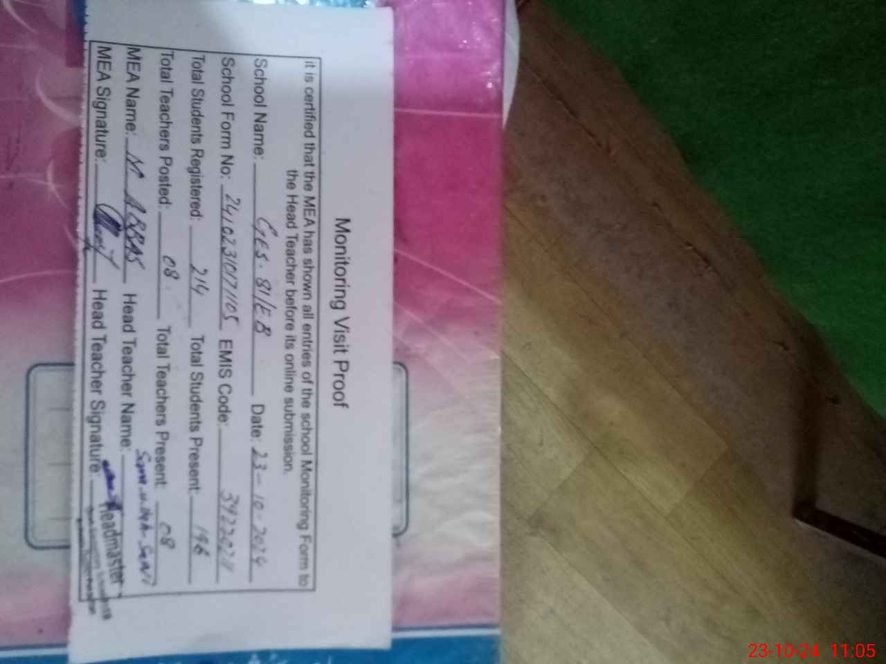 | Attendance Register | Head Teacher | MEA with School | Visit Proof |