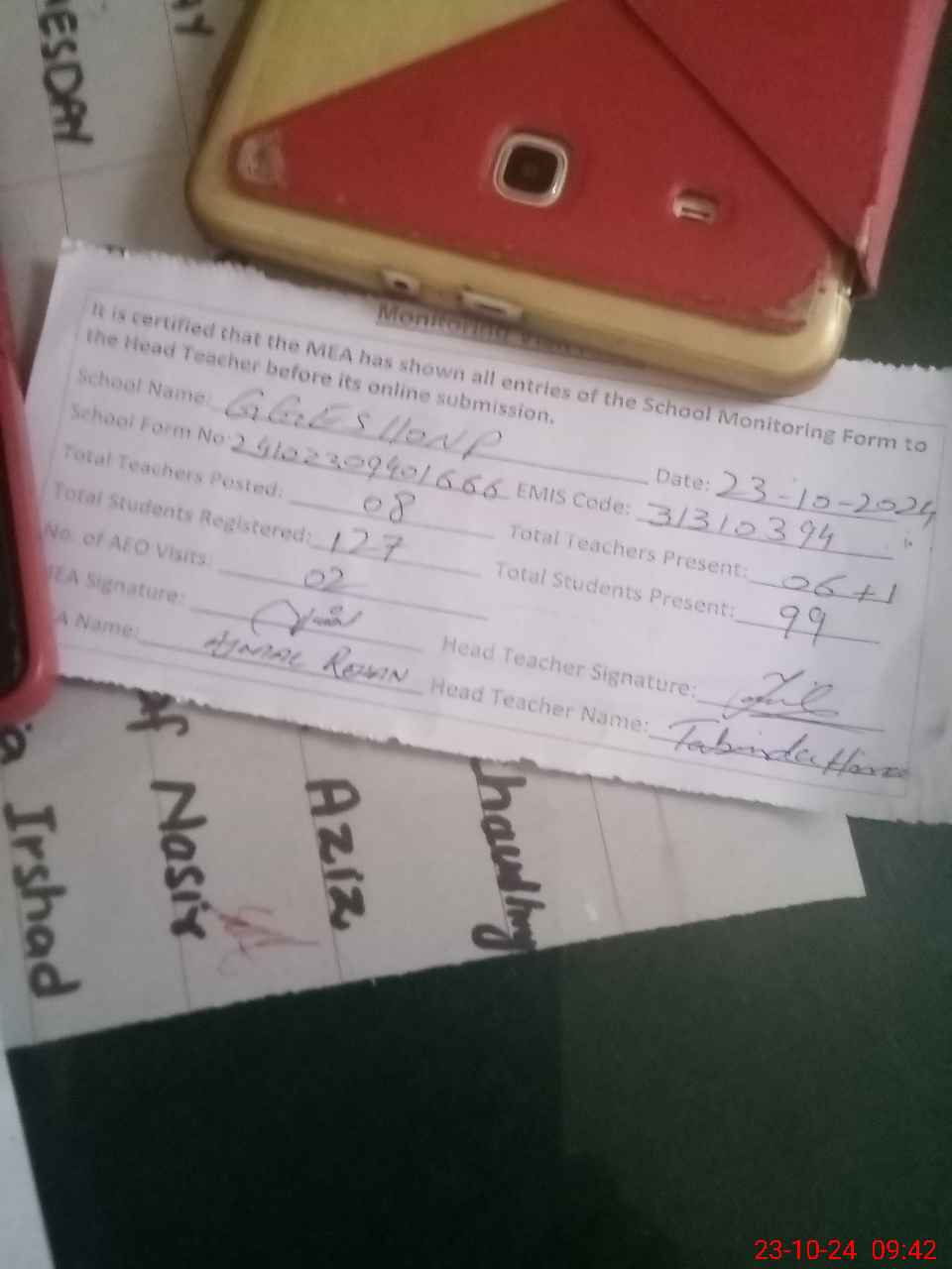 | Attendance Register | Head Teacher | MEA with School | Visit Proof |