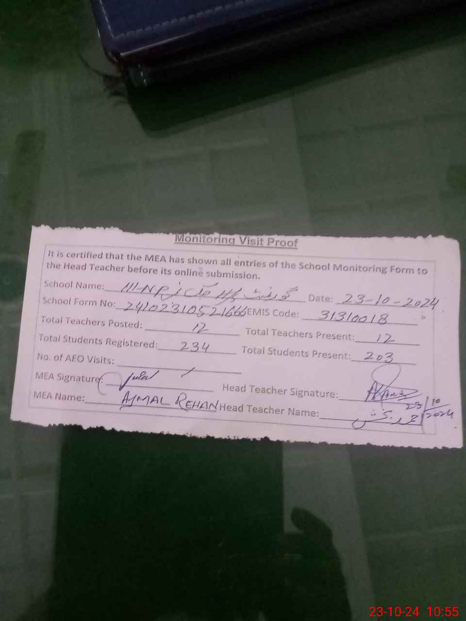 | Attendance Register | Head Teacher | MEA with School | Visit Proof |