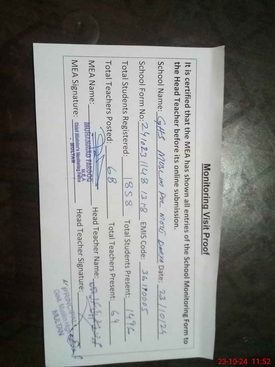 | Attendance Register | Head Teacher | MEA with School | Visit Proof |