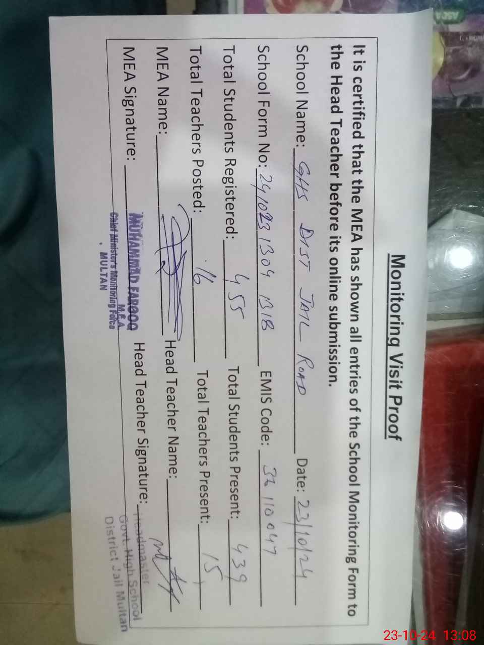 | EMIS Code: 36110047 | Name of School: GHS DISTRICT JAIL MULTAN | |||