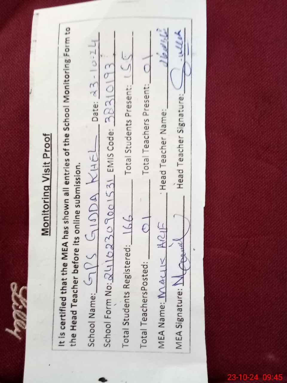 | EMIS Code: 38310193 | Name of School: GPS GIDDA KHEL | |||