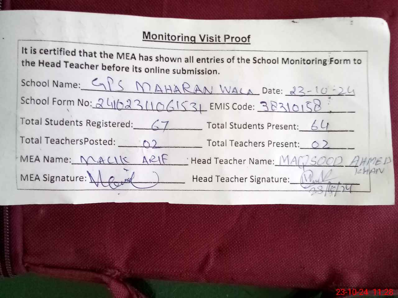 | EMIS Code: 38310158 | Name of School: GPS MAHARAN WALA TRAG | |||