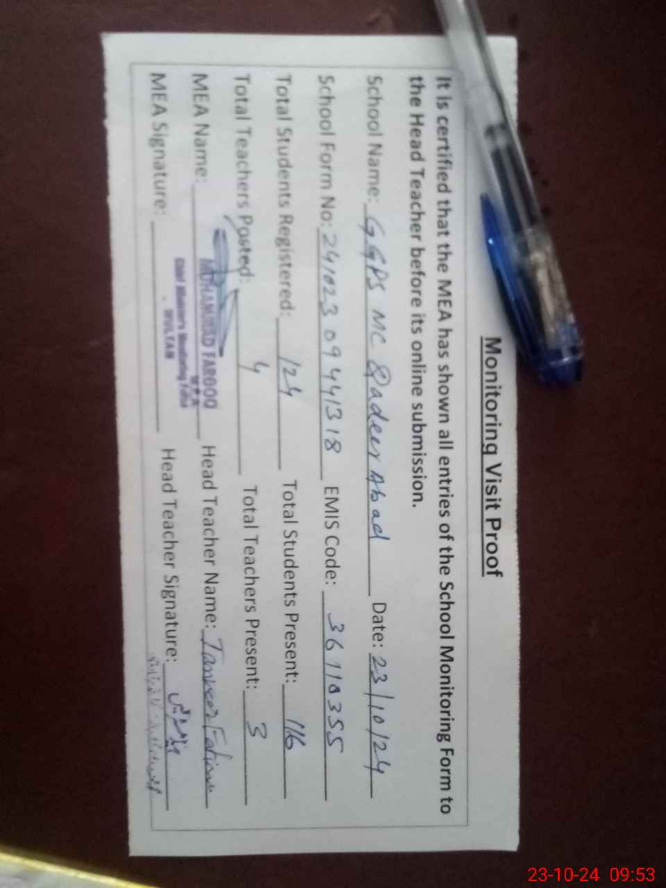 | Attendance Register | Head Teacher | MEA with School | Visit Proof |