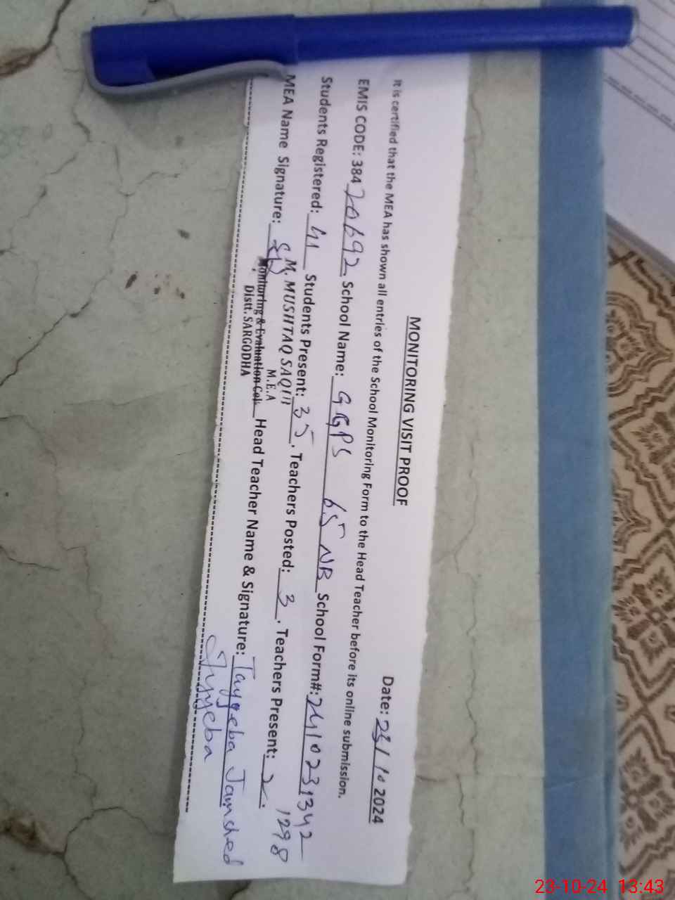 | Attendance Register | Head Teacher | MEA with School | Visit Proof |