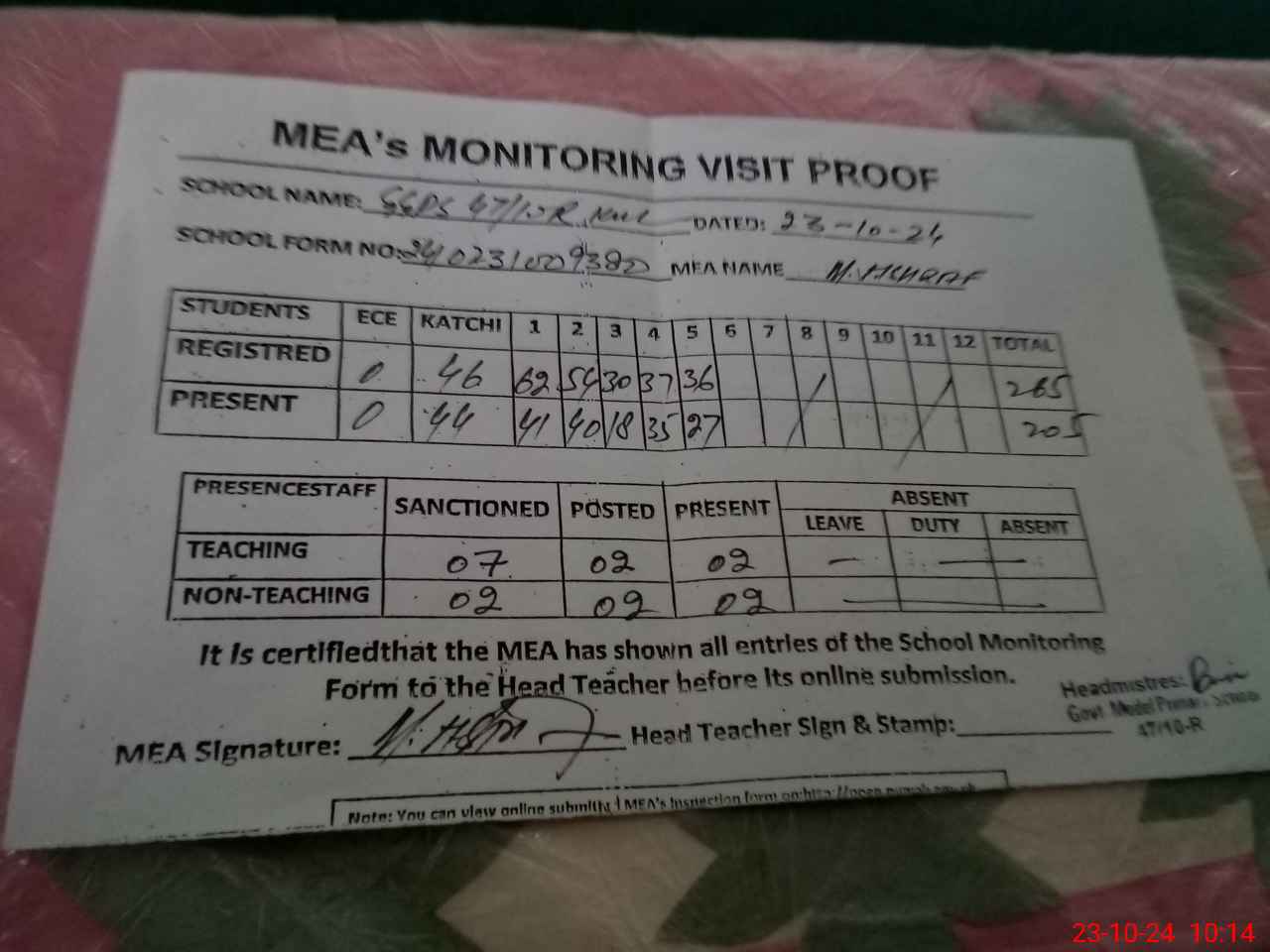 | Attendance Register | Head Teacher | MEA with School | Visit Proof |