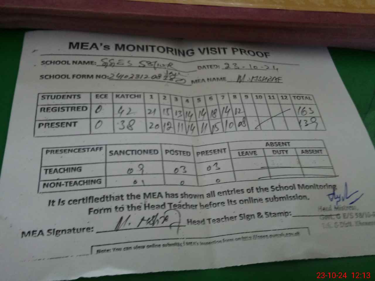| Attendance Register | Head Teacher | MEA with School | Visit Proof |