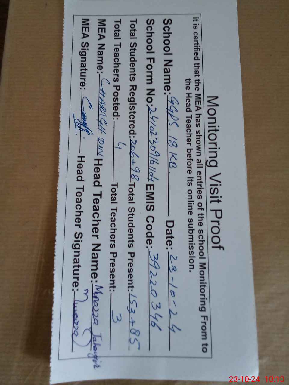 | Attendance Register | Head Teacher | MEA with School | Visit Proof |