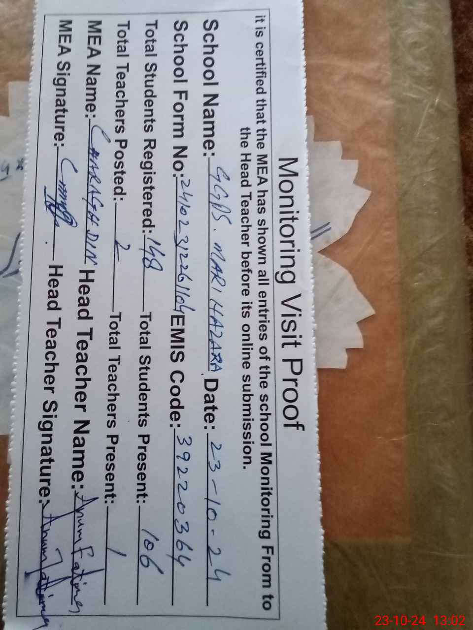 | Attendance Register | Head Teacher | MEA with School | Visit Proof |