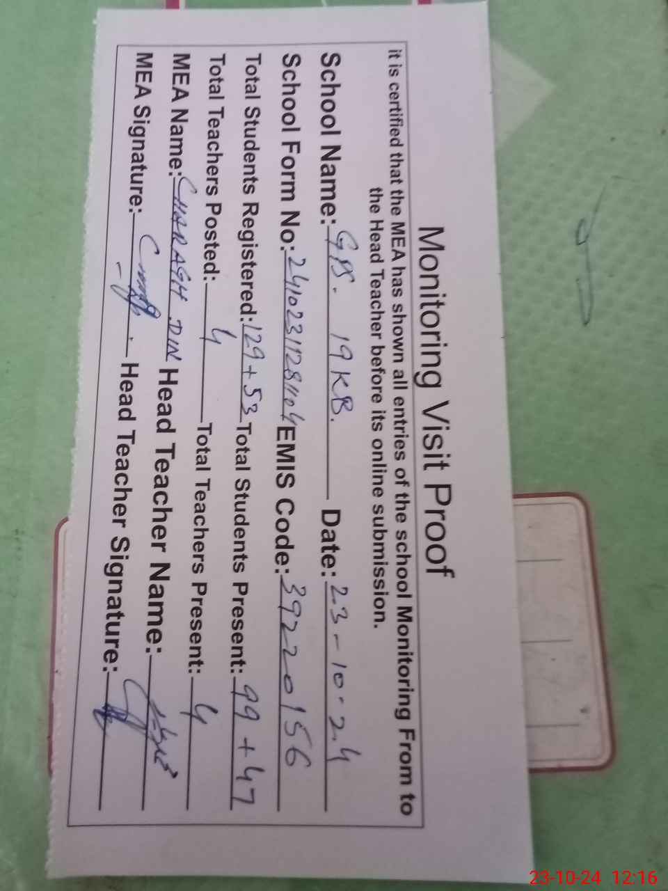 | EMIS Code: 39220156 | Name of School: GPS CHAK NO. 19 KB | |||