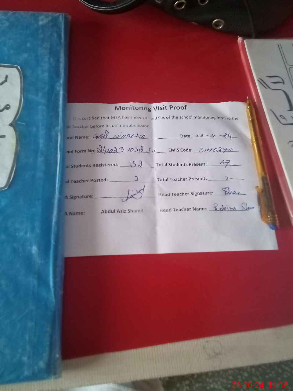 | Attendance Register | Head Teacher | MEA with School | Visit Proof |