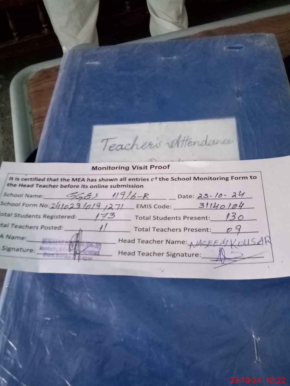| Attendance Register | Head Teacher | MEA with School | Visit Proof |