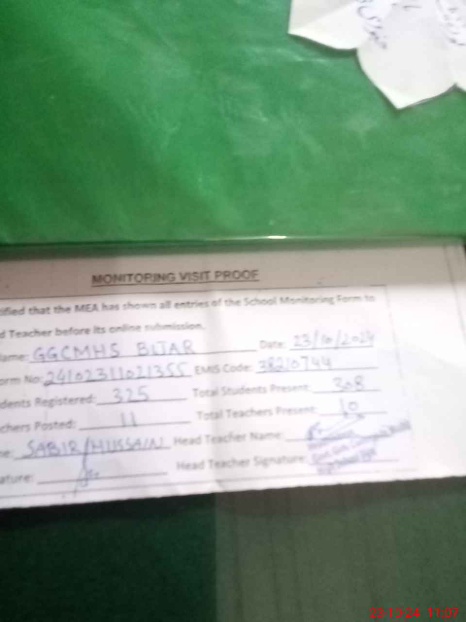 | Certified that this School was Inspected by the Undersigned MEA/DMO Today and the Information Stated Above is as Per Record. | |||||