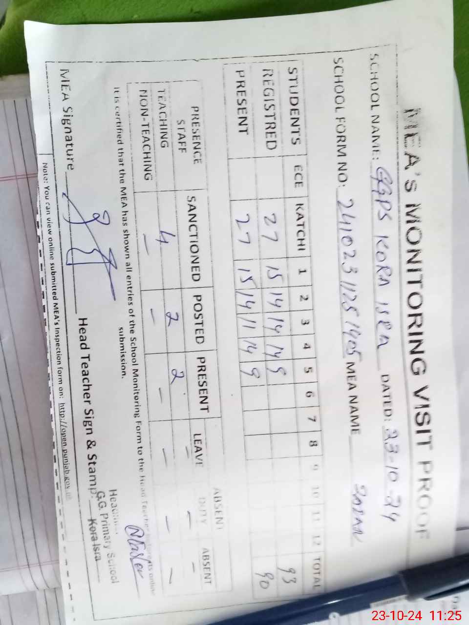 | Attendance Register | Head Teacher | MEA with School | Visit Proof |