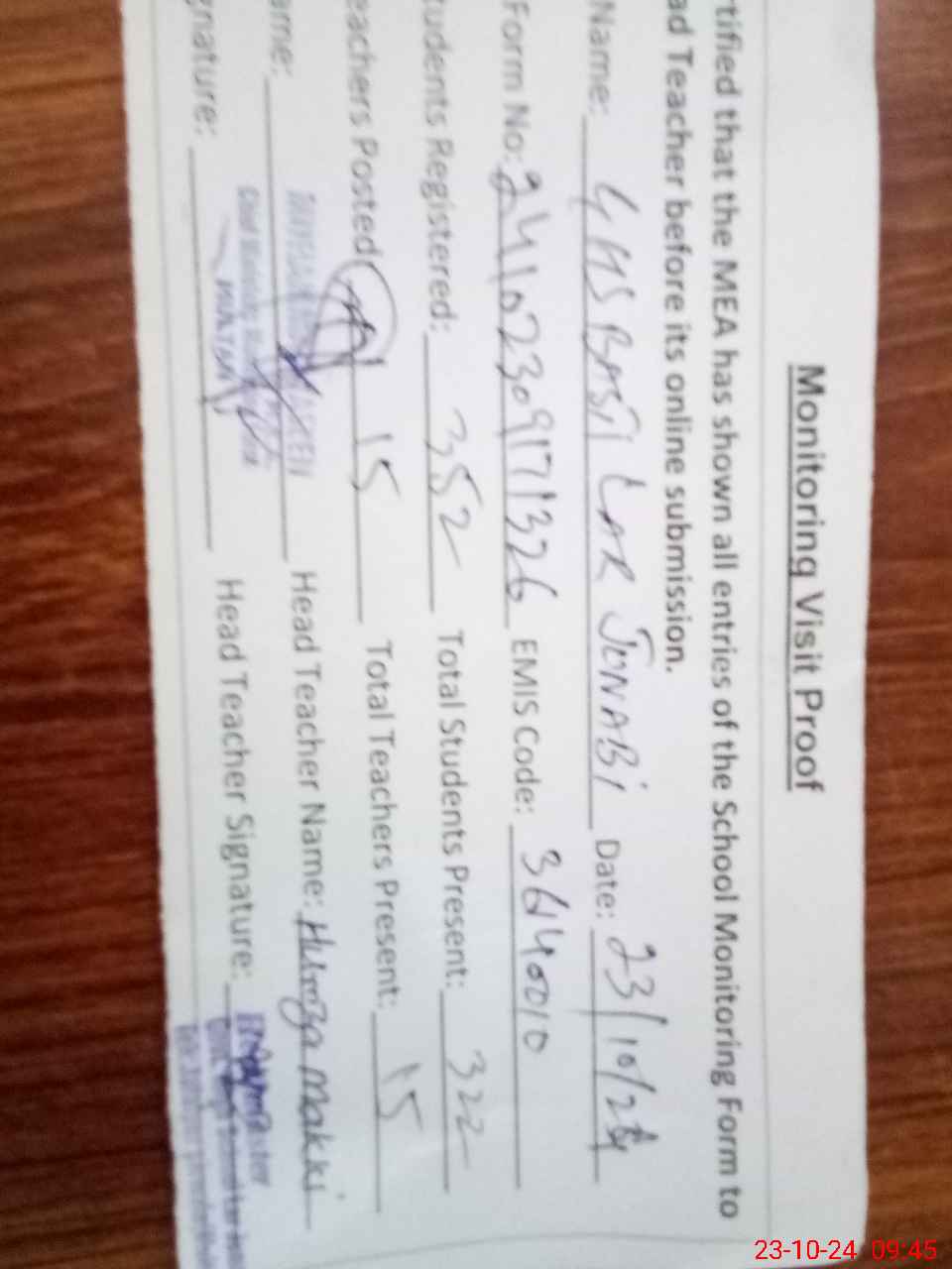 | Certified that this School was Inspected by the Undersigned MEA/DMO Today and the Information Stated Above is as Per Record. | |||||