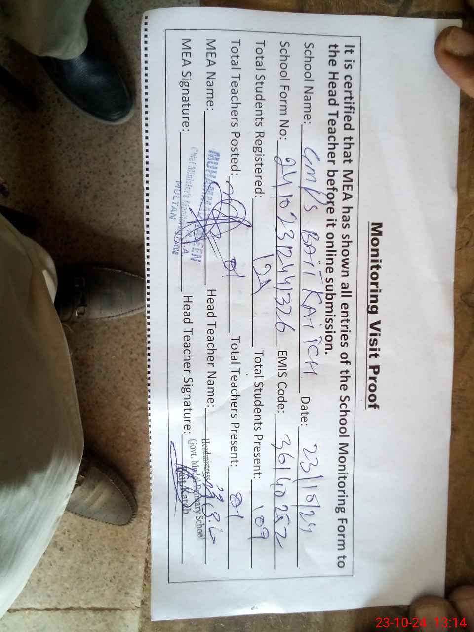| Certified that this School was Inspected by the Undersigned MEA/DMO Today and the Information Stated Above is as Per Record. | |||||