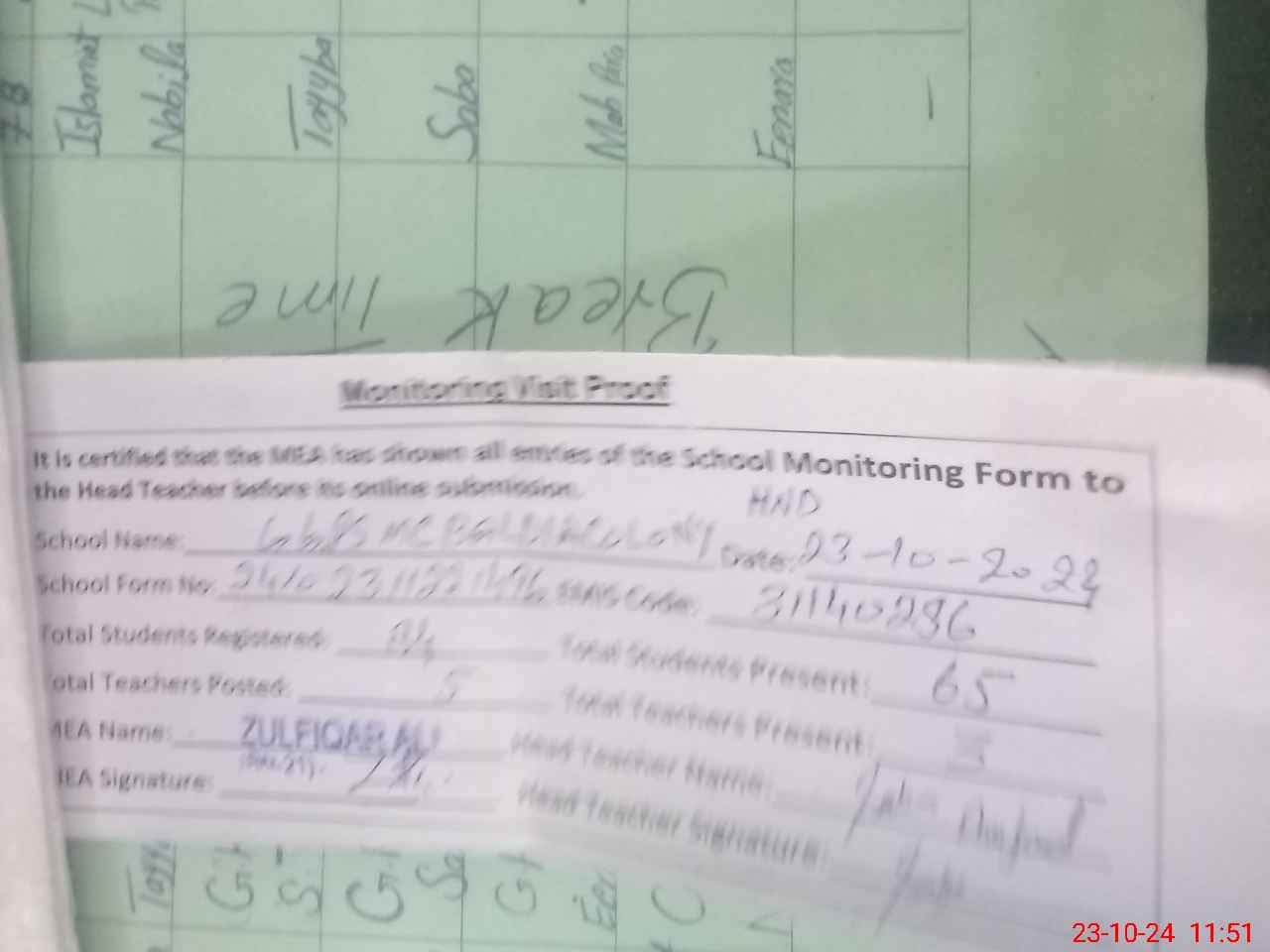 | Certified that this School was Inspected by the Undersigned MEA/DMO Today and the Information Stated Above is as Per Record. | |||||