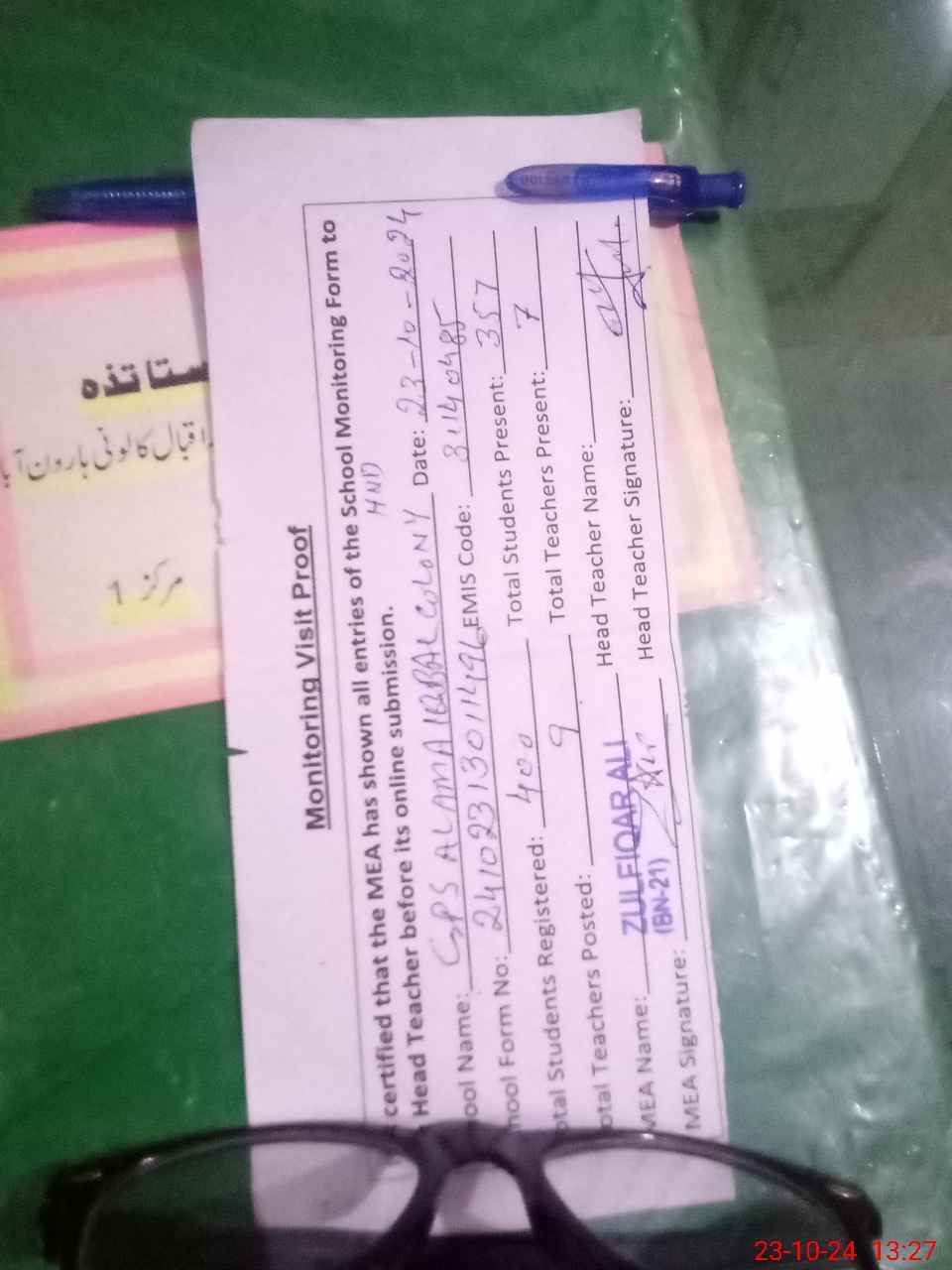 | Attendance Register | Head Teacher | MEA with School | Visit Proof |