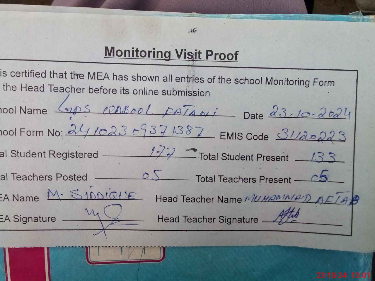 | EMIS Code: 31120223 | Name of School: GPS QABOOL FATANI | |||