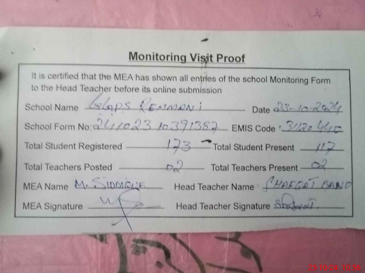| Attendance Register | Head Teacher | MEA with School | Visit Proof |