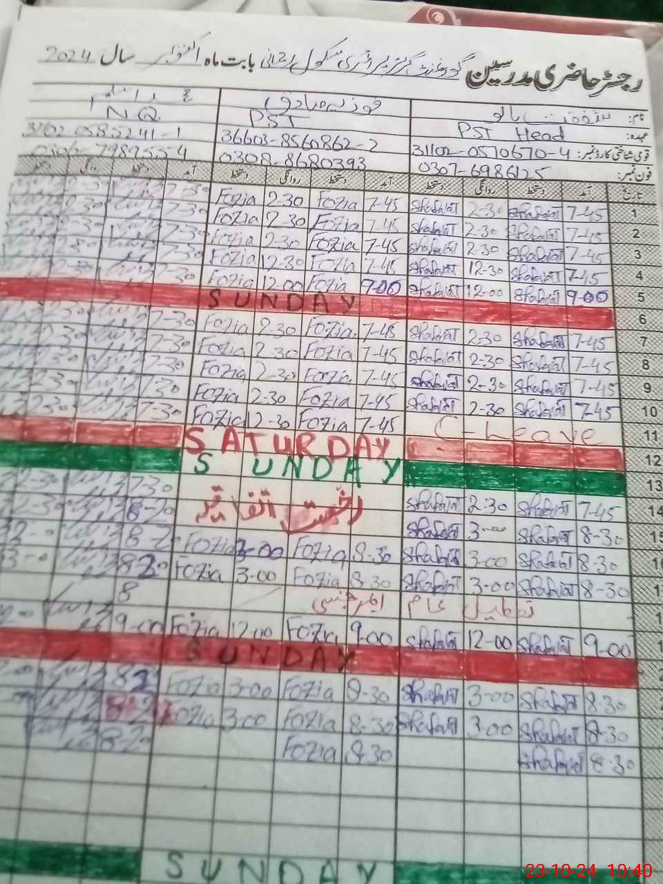 | Leave | Duty | Absent | Maternity | Medical | Ex- Pak |