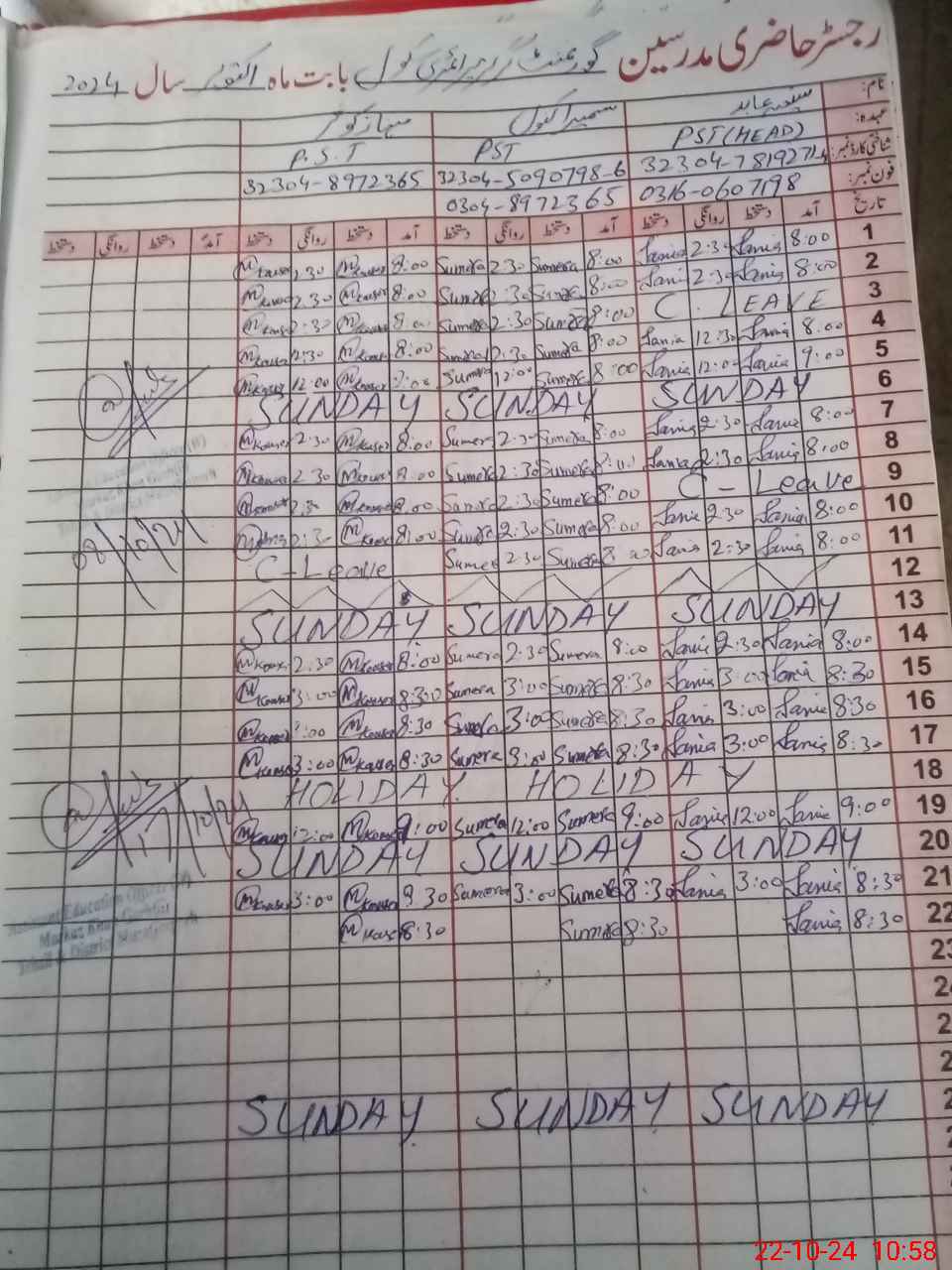 | CNIC | Full Name | Designation | R/C | Absence During Last Calender Month |